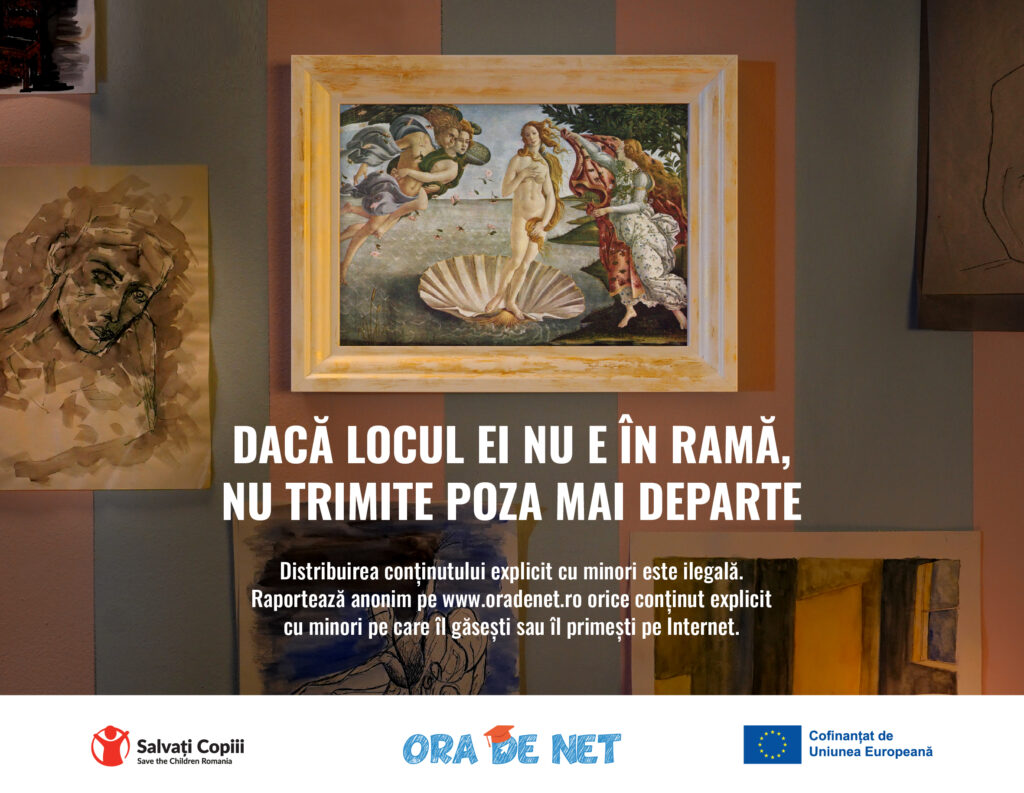 Campania „Dacă locul ei nu e în ramă, nu trimite poza mai departe” își propune să schimbe perspectiva asupra distribuirii imaginilor explicite care implică minori, aducând în prim-plan o realitate ignorată: atunci când astfel de imagini circulă online, există mai multe niveluri de responsabilitate – persoana care le-a generat, cea care le-a primit și, mai ales, cei care aleg să le redistribuie. Campania derulată de Salvați Copiii nu vizează condamnarea celor implicați, ci prevenția – printr-un mesaj care nu judecă, ci oferă încredere și opțiuni. Scopul este acela ca adolescenții să înțeleagă că au puterea de a opri un abuz, că pot alege să nu dea mai departe și că pot acționa inteligent și curajos într-o situație vulnerabilă. Dacă o imagine nu e de pus în ramă, atunci nu e de dat mai departe.
