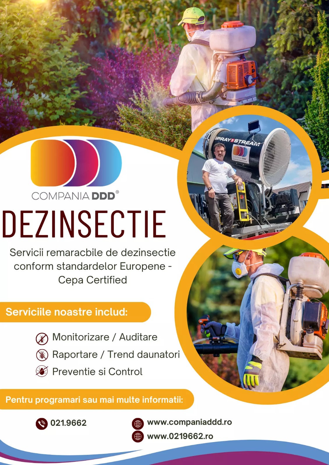 Compania DDD® este autorizată de DSP, DSV, Direcția Arme, Explozivi și Substanțe Periculoase din cadrul Poliției Române, Ministerul Mediului și Ministerul Agriculturii și Dezvoltării Rurale pentru tratamente fitosanitare. Aceste autorizații reflectă angajamentul nostru față de standardele înalte de siguranță și calitate.