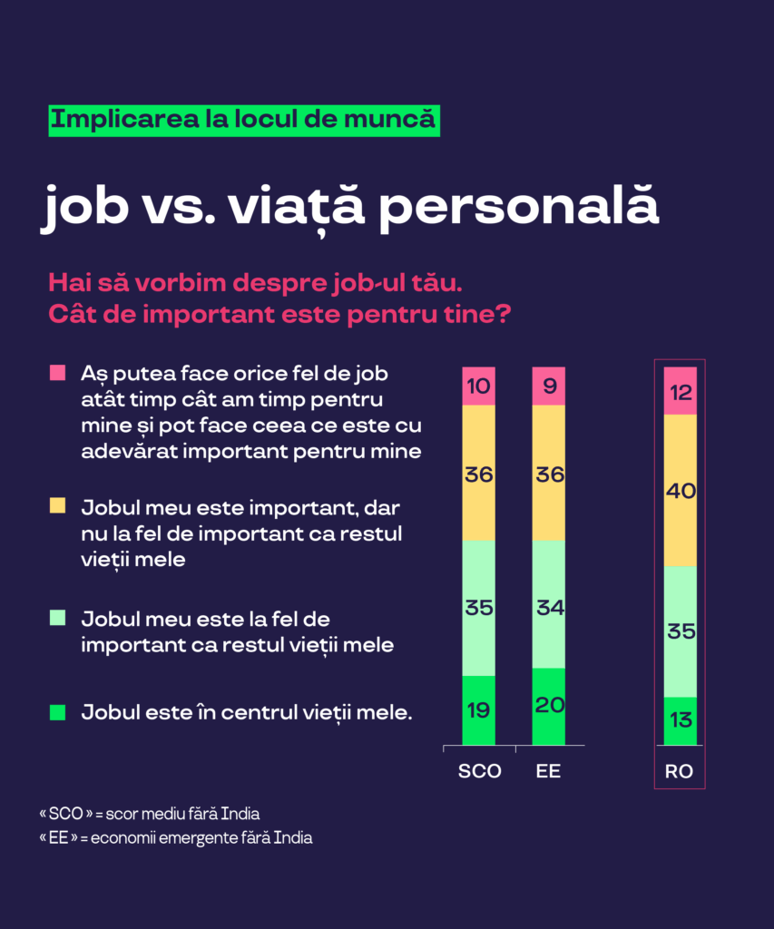 | Cifre cheie din cadrul studiului 83% dintre angajați “iubesc” sau spun că “le place” compania lor, iar starea de bine la locul de muncă este evaluată la 7.8/10 în medie (8.1/10 în România)46% spun că “muncesc cât de mult pot” (43% în România), în timp ce 34% îndeplinesc așteptările, dar stabilesc limite atunci când este necesar (35% în România) 19% dintre angajații din întreaga lume plasează locul de muncă în centrul vieții lor (13% în România), în timp ce 35% consideră că job-ul este la fel de important ca restul vieții lor (35% în România)Cei mai importanți doi factori care determină atractivitatea unui angajator rămân salariul bun (53%) și beneficiile “care răspund nevoilor mele” (36%)Angajații se simt împliniți în special datorită atmosferei de lucru plăcute și care oferă grijă (43%) și datorită recunoașterii (38%)56% dintre angajați spun că principalul factor care contribuie la o viață bună este legătura cu ceilalți (familie, prieteni, colegi), urmat de timpul personal (42%)42% dintre angajați sunt implicați în comunitatea lor prin activități sportive, educaționale, artistice și culturale, de protecție a mediului, etc. (37% în România) și 20% și-ar dori să fie implicați (26% în România).Principalele preocupări ale angajaților români sunt: sănătatea (20% „nu se pot opri din a se preocupa de acest subiect”),pierderea locului de muncă (19%) și teama că țara va fi implicată într-un război (19%).Angajații români au mai mare încredere în propriul viitor (76%) decât în viitorul țării (51%) sau cel al planetei (58%).75% dintre angajații români consideră că munca are un rol important, dar că nu reprezintă singurul scop din viață (similar cu 71% global).Doar 9% dintre angajații români sunt complet neimplicați la job.6din 10 români spun că au o legătură apropiată cu compania pentru care lucrează și că intenționează să rămână la actualul job atât de mult cât e posibil. 23% dintre români susțin că ”iubesc” compania pentru care lucrează .Românii merg la job pentru că le place mediul de lucru (52%), le face plăcere activitatea pe care o fac (48%) și ca să plătească facturile (51%). Găsiți studiul complet pe www.pluxee.ro. |